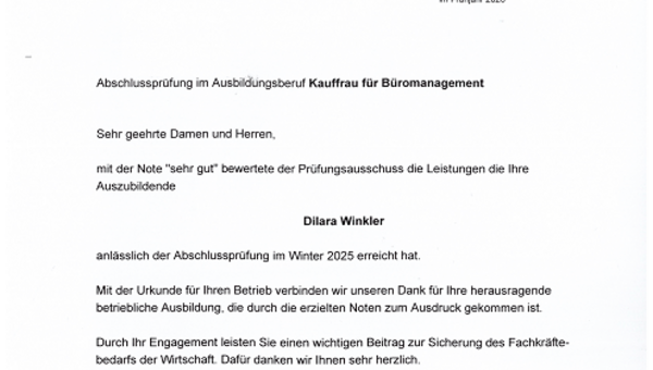 Frau Dilara Winkler besteht ihre IHK-Abschlussprüfung mit der Bestnote „sehr gut“ im Ausbildungsberuf „Kauffrau für Büromanagement“