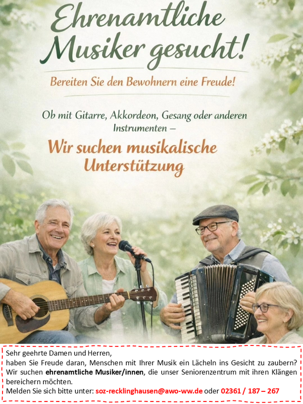 haben Sie Freude daran, Menschen mit Ihrer Musik ein Lächeln ins Gesicht zu zaubern? Wir suchen ehrenamtliche Musiker/innen, die unser Seniorenzentrum mit ihren Klängen bereichern möchten.