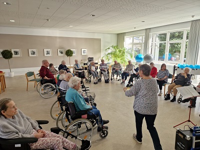 Frau Simon ist unsere ehrenamtliche Sängerin, die sich jeden Dienstag im Neubau und jeden Donnerstag im Altbau Zeit nimmt und mit den Bewohnern*innen des AWO Seniorenzentrums Recklinghausen singt, tanzt und feiert.