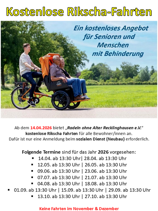 Ab sofort bietet „Radeln ohne Alter Recklinghausen e.V.“ wieder kostenlose Rikscha-Fahrten für die Bewohner/innen des AWO Seniorenzentrums Recklinghausen an.